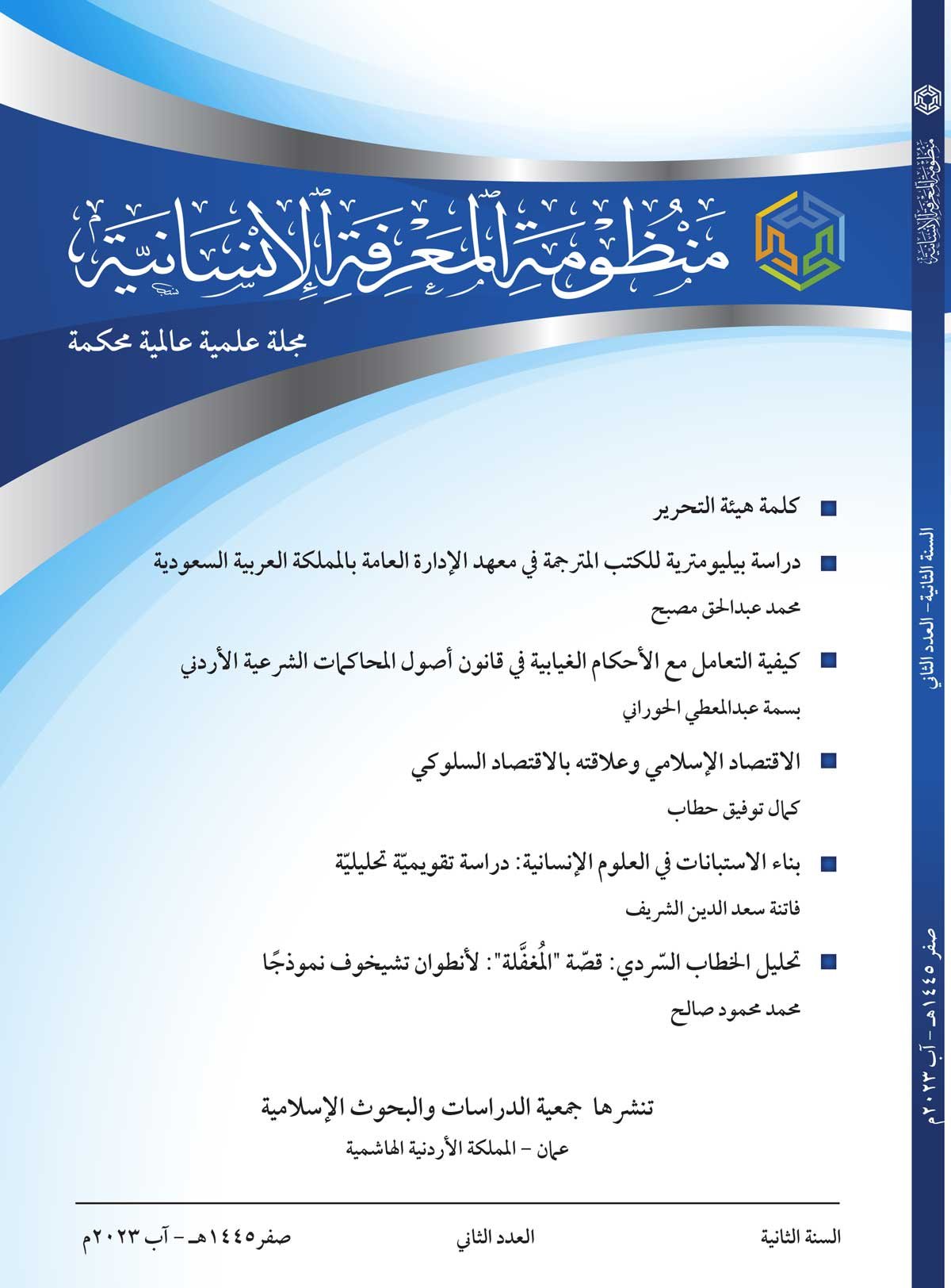 مجلة منظومة المعرفة الإنسانية مجلة بحثية علمية محكّمة تصدر فصليًا بالعربية والإنجليزية عن جمعية الدراسات والبحوث الإسلامية (عمّان–الأردن). تُعنى بنشر البحوث الأصيلة في حقول الإنسانيات وفق معايير البحث العلمي المعتمدة، وتدمج بين الدراسات النظرية والتطبيقية. تستكشف أثر العلوم في واقع المجتمعات وآفاقها المستقبلية في مجالات مثل علم الاجتماع، الأديان، التربية، الاقتصاد، السياسة، التاريخ، والعلوم الشرعية والإدارية والمالية، والدراسات الأدبية والفنية والفلسفية.